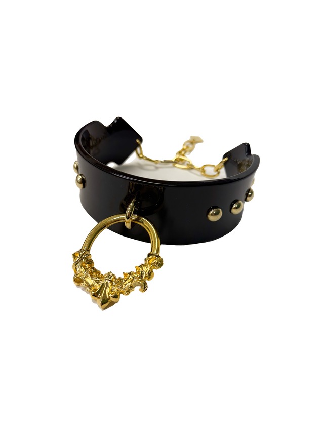 Knocker Choker オリジナルノッカーリングが目を引くアクリルチョーカー 2色展開で Marble べっこうは透明感あるアクリルにクリススタルが輝きます (1つ1つ柄の出方に個体差がございます。) Black 王道ブラックにゴールドの鋲が付いたブランドらしい1点 どちらを前にしても着用可能です。 アクリル素材のバングル 高さ50mm 真鍮+メッキ アクリル樹脂 ※写真はサンプルとなり、予告なく生地や仕様が変更させる場合がございます。ご了承ください。 ※お使いのブラウザ環境、照明により、実際の色味と異なることがございます。