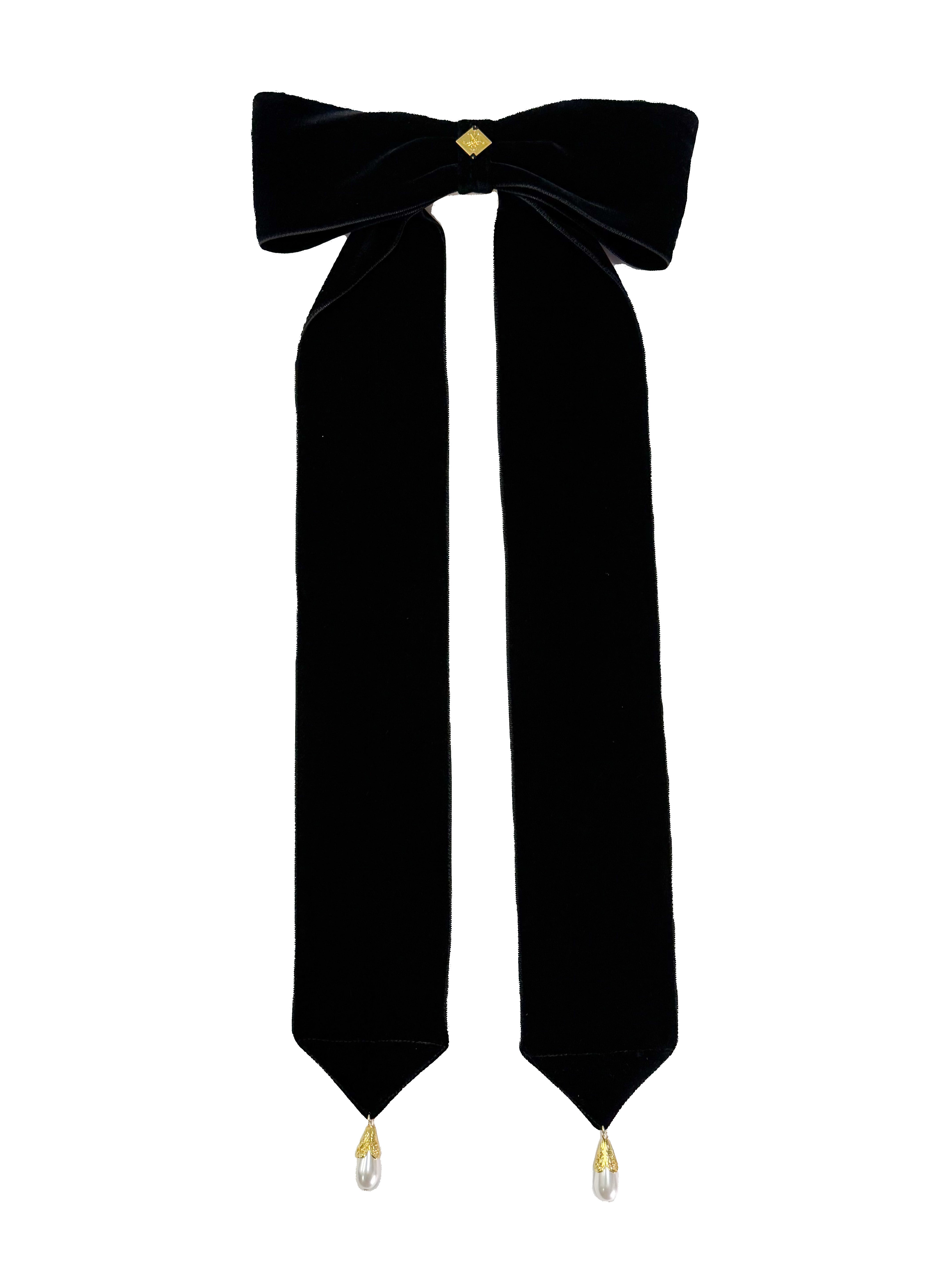 リボンの先にはメタルパーツで装飾されたドロップ型のパールが揺れます。