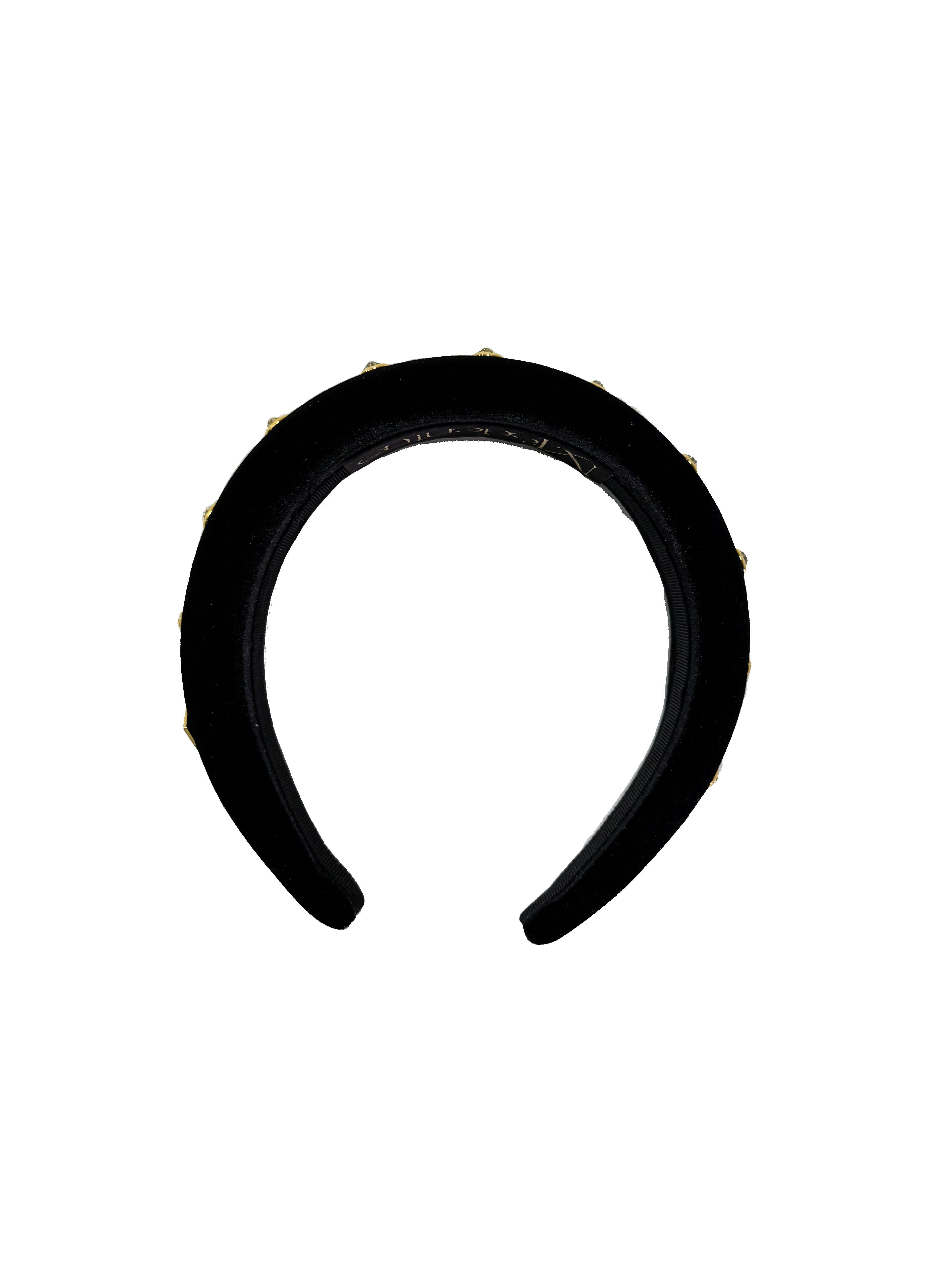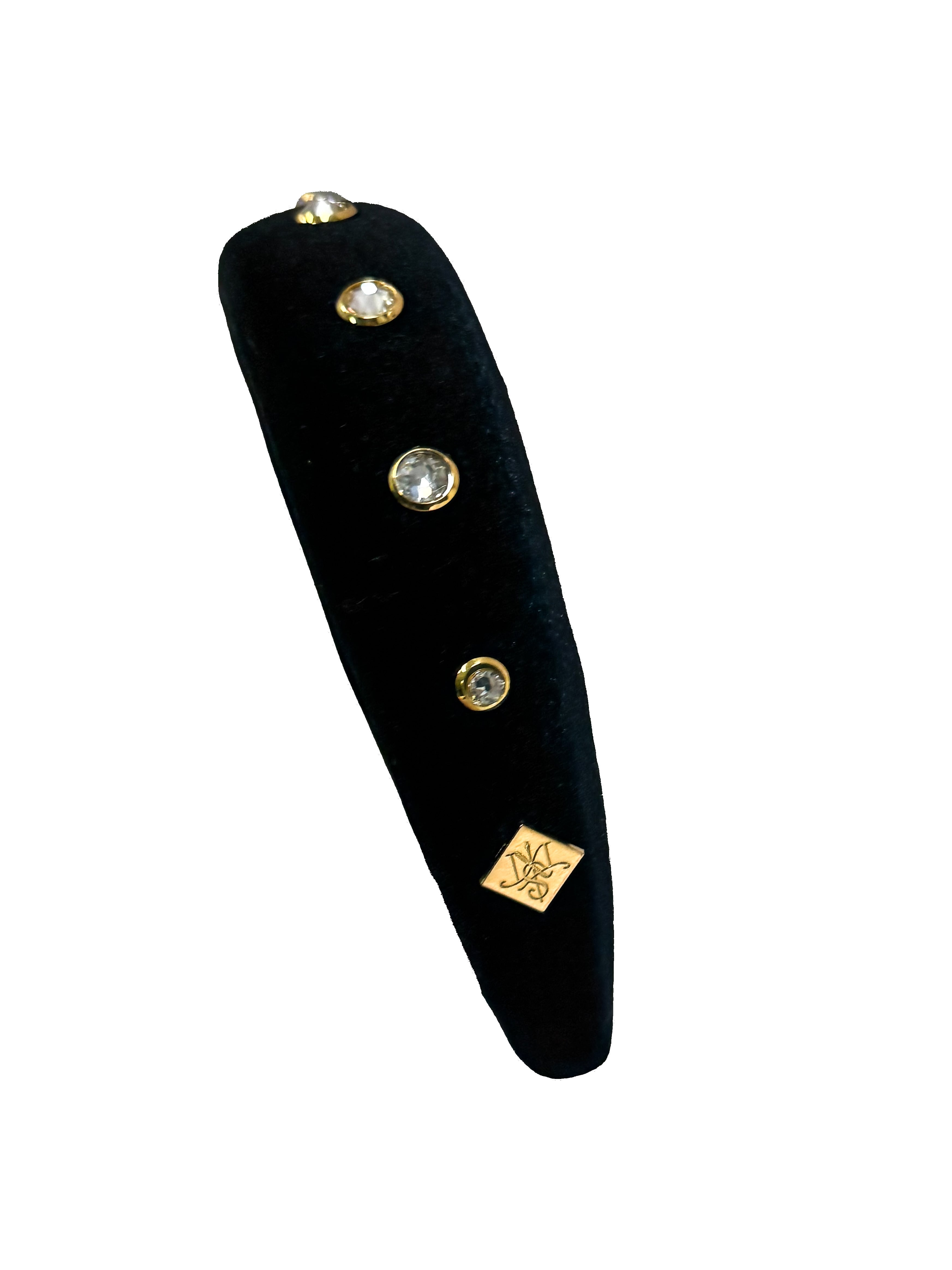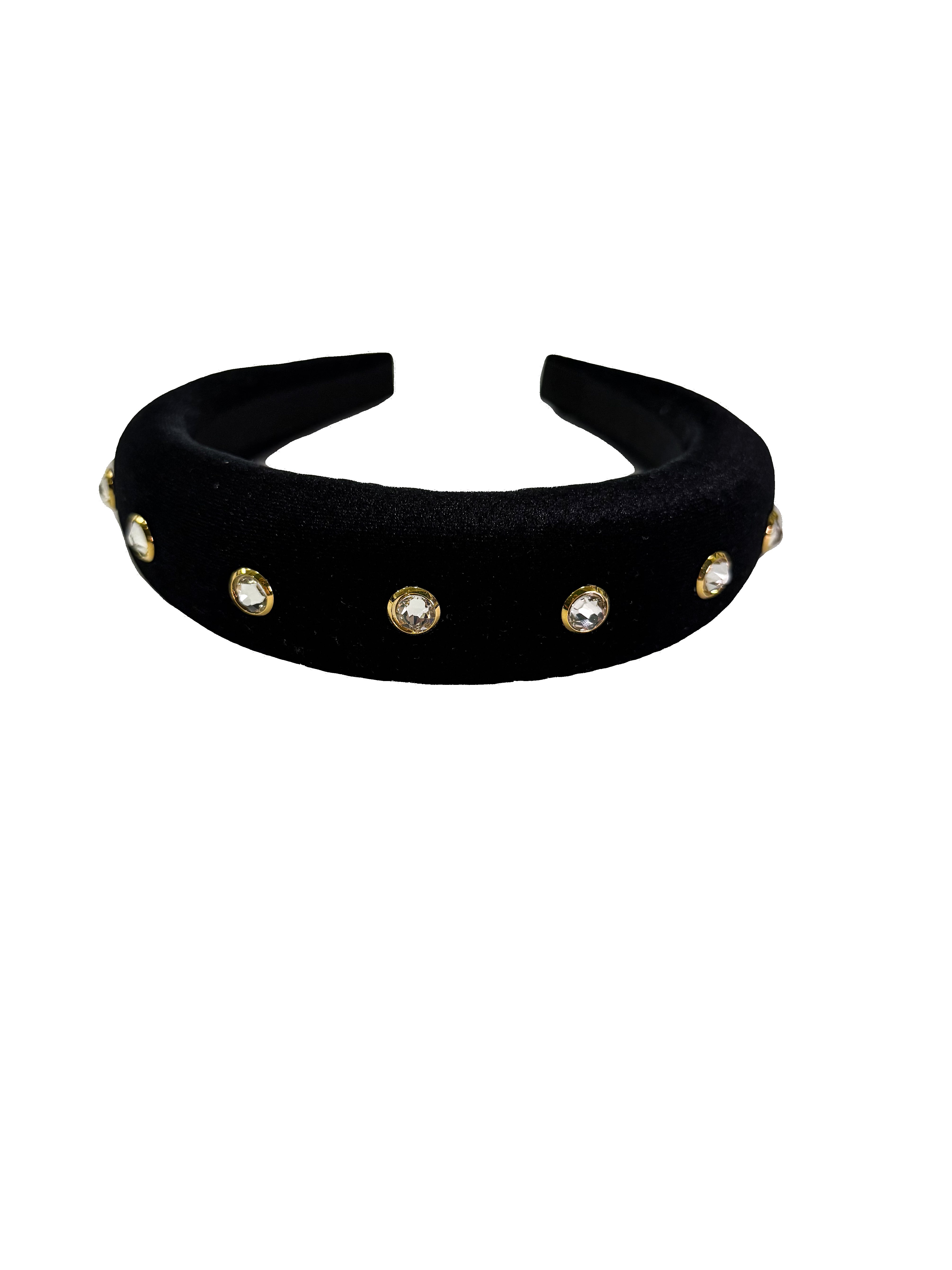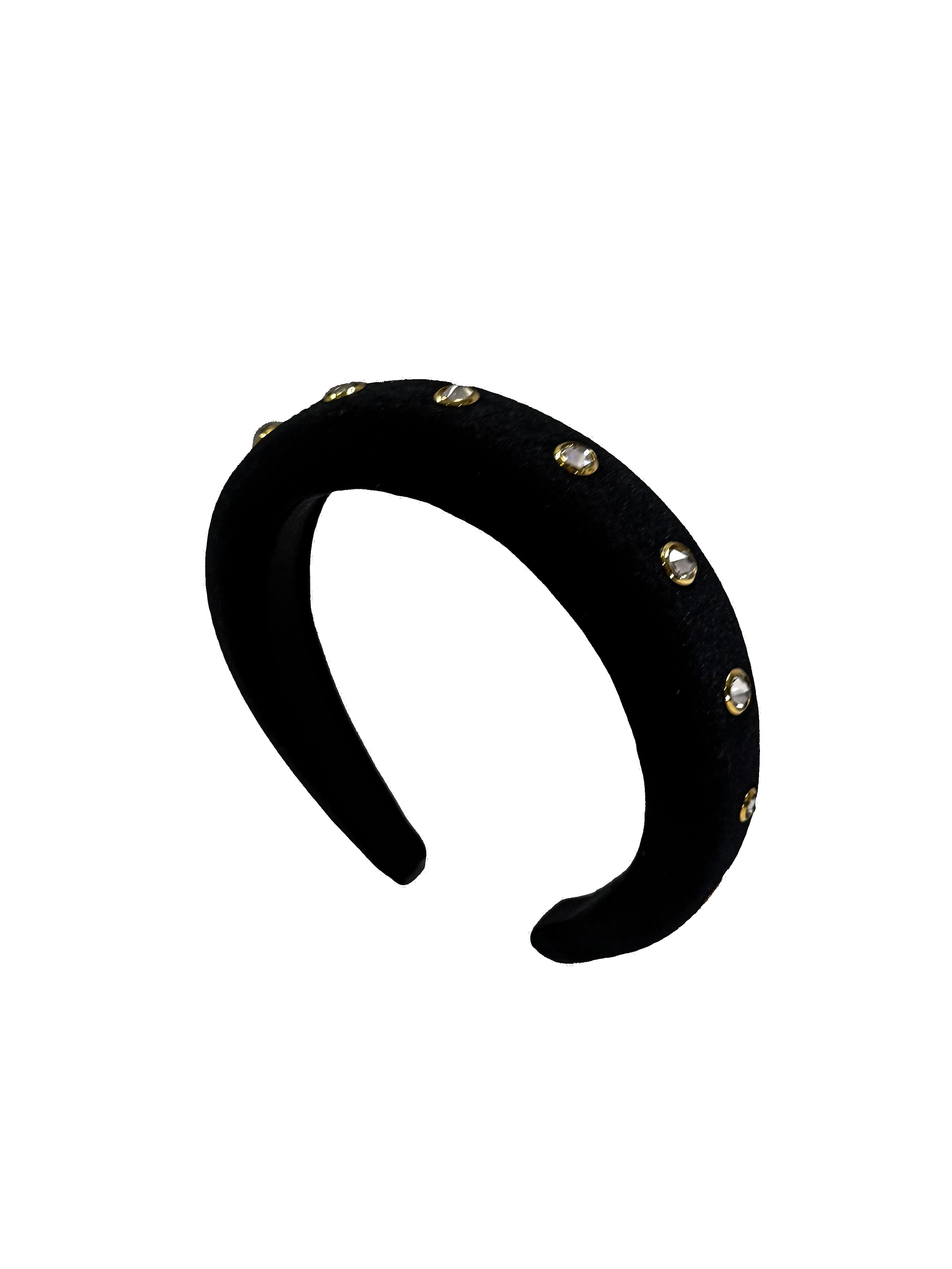 高さのあるベロア生地のカチューシャにクリスタルパーツが付いたデザイン