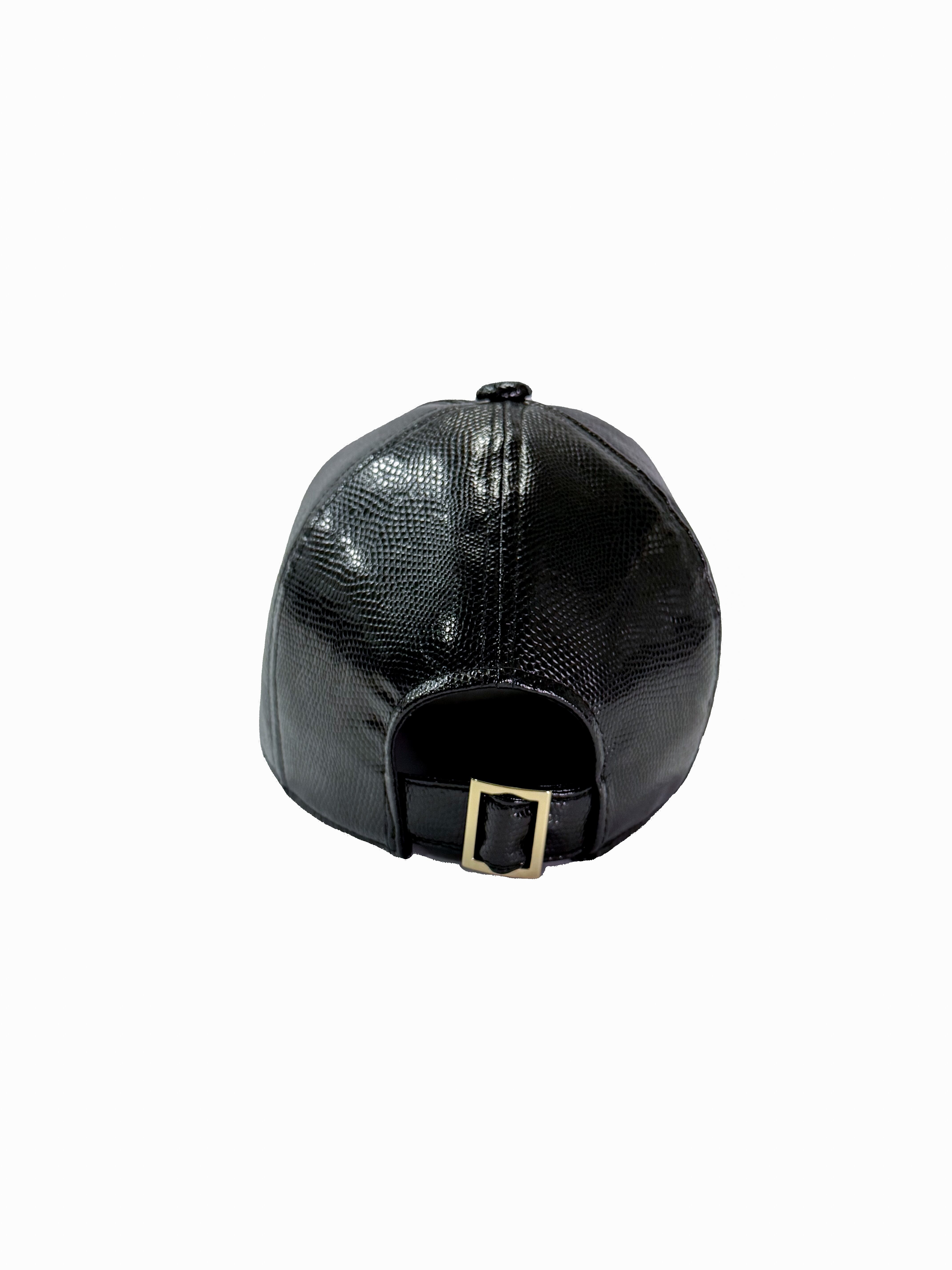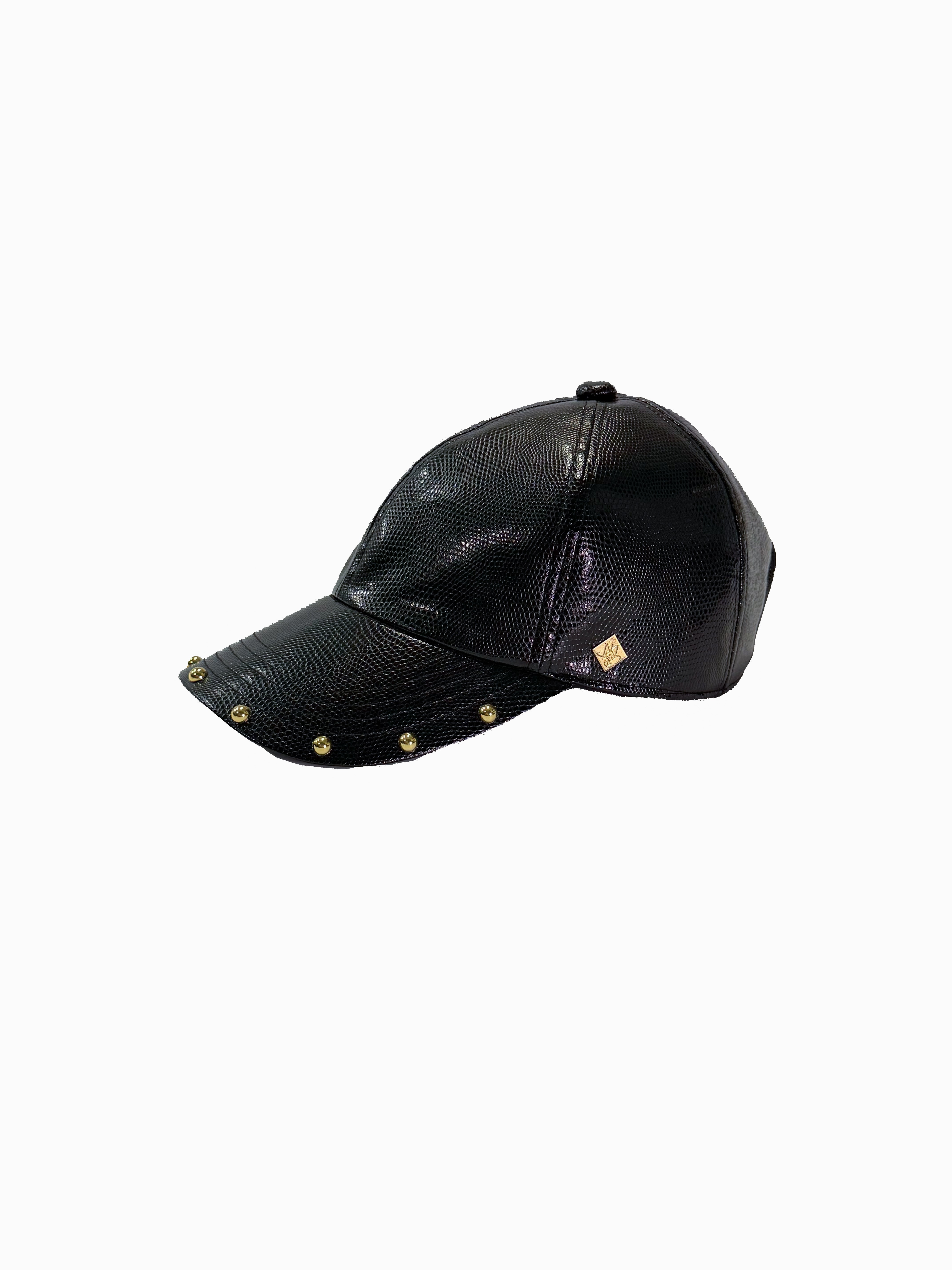 合成皮革リザード生地のキャップにメタルパーツが付いたデザイン