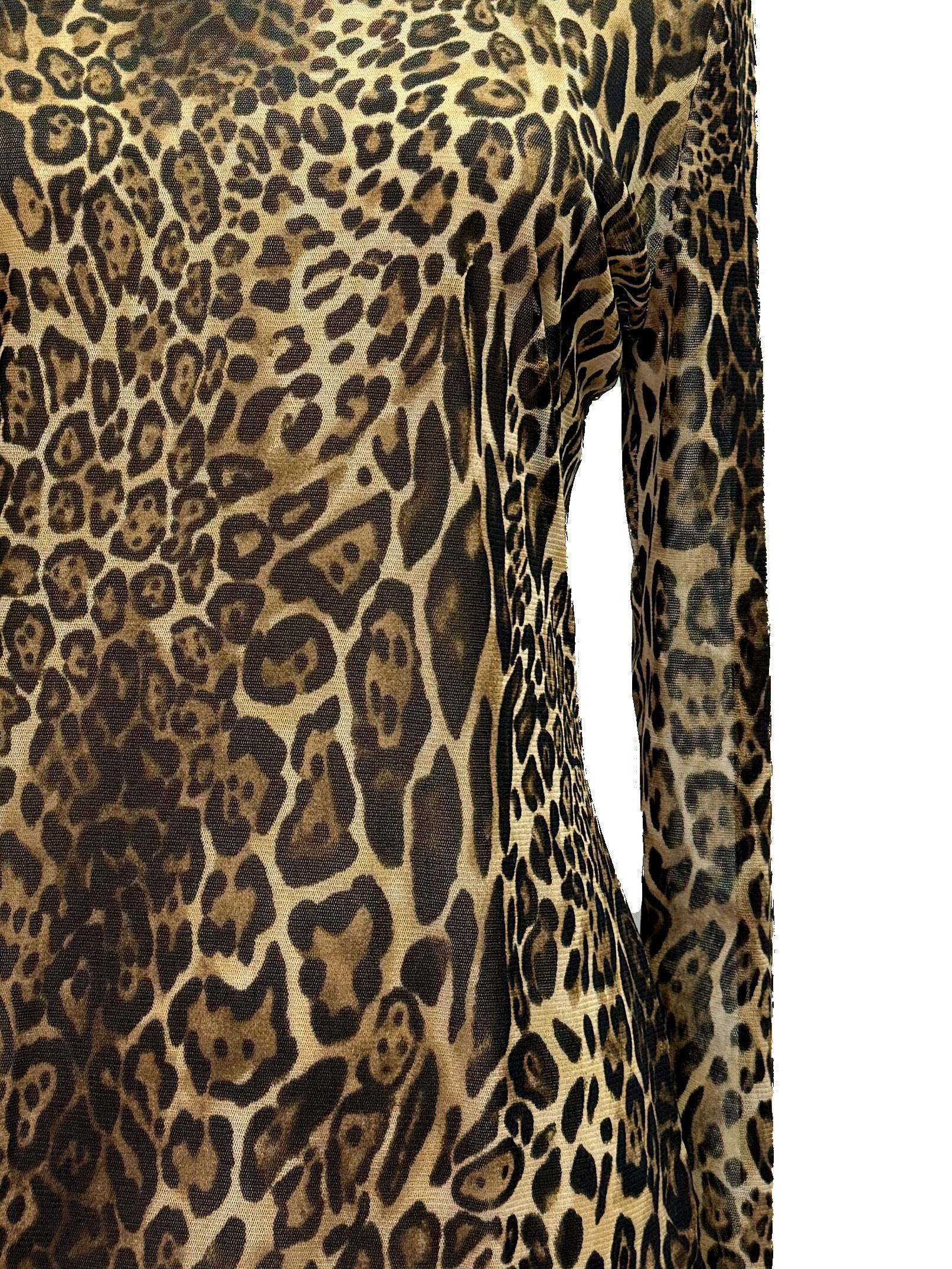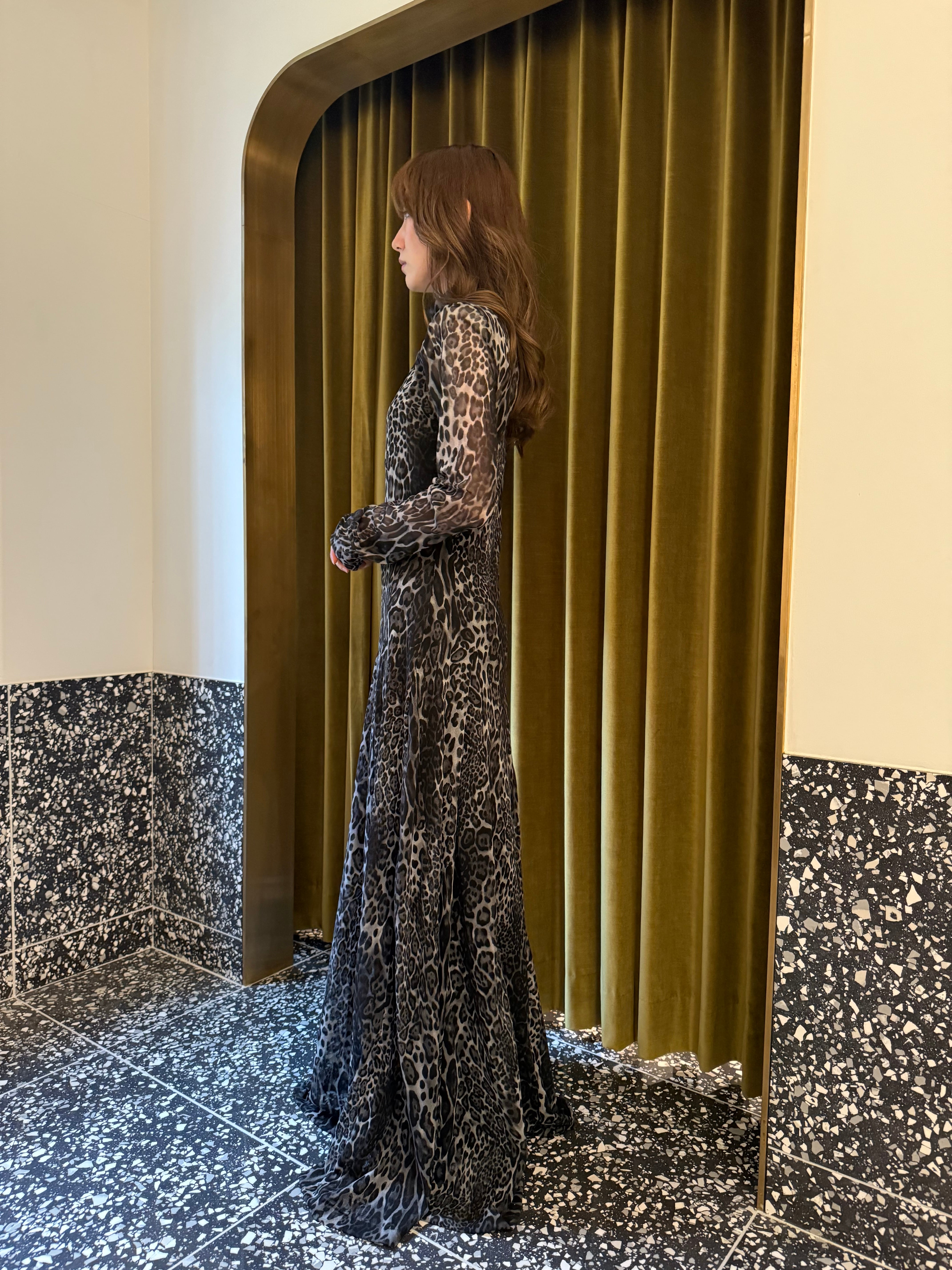 ヒョウ柄の生地を全面に使用したインパクトのあるドレス。