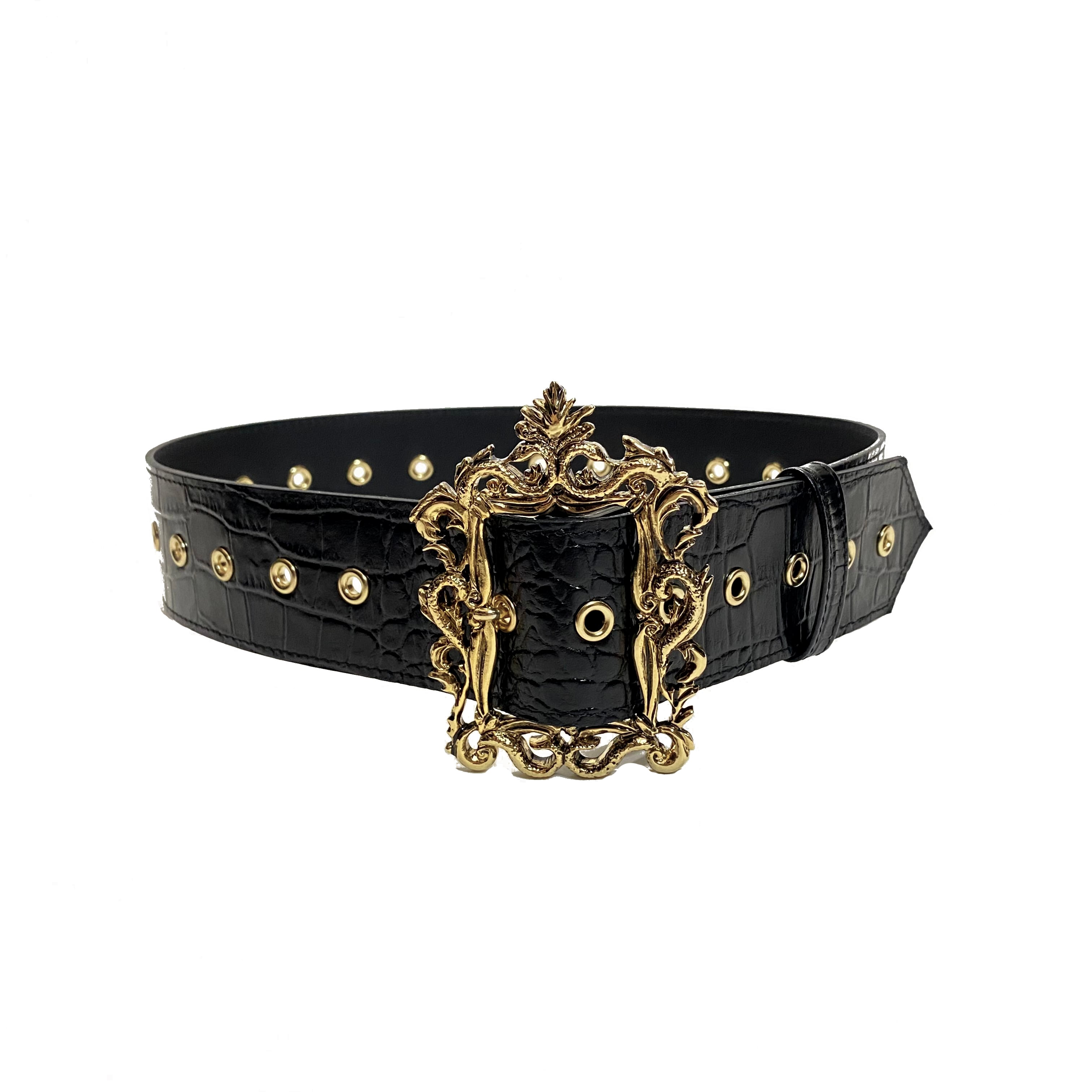 ベルトは牛革にクロコの型押し、ゴールドのハトメが光ります。