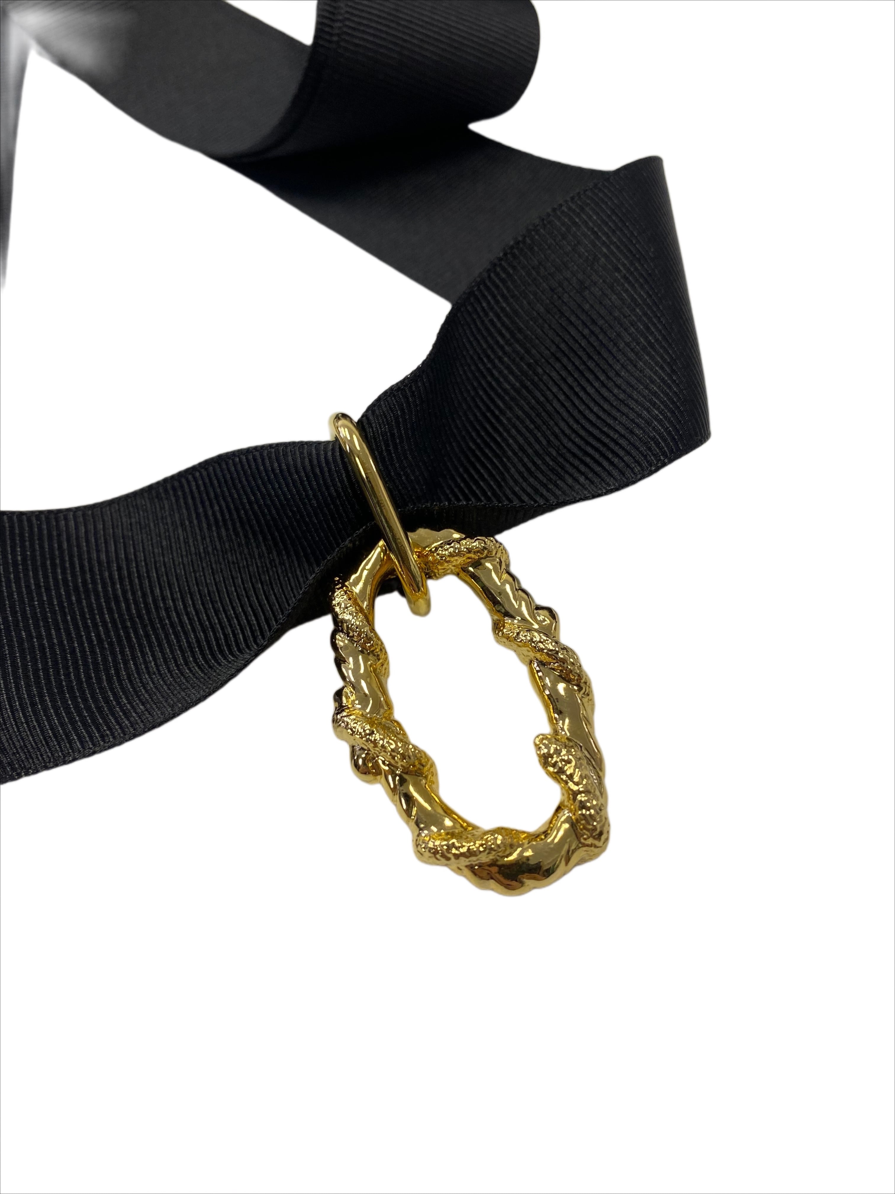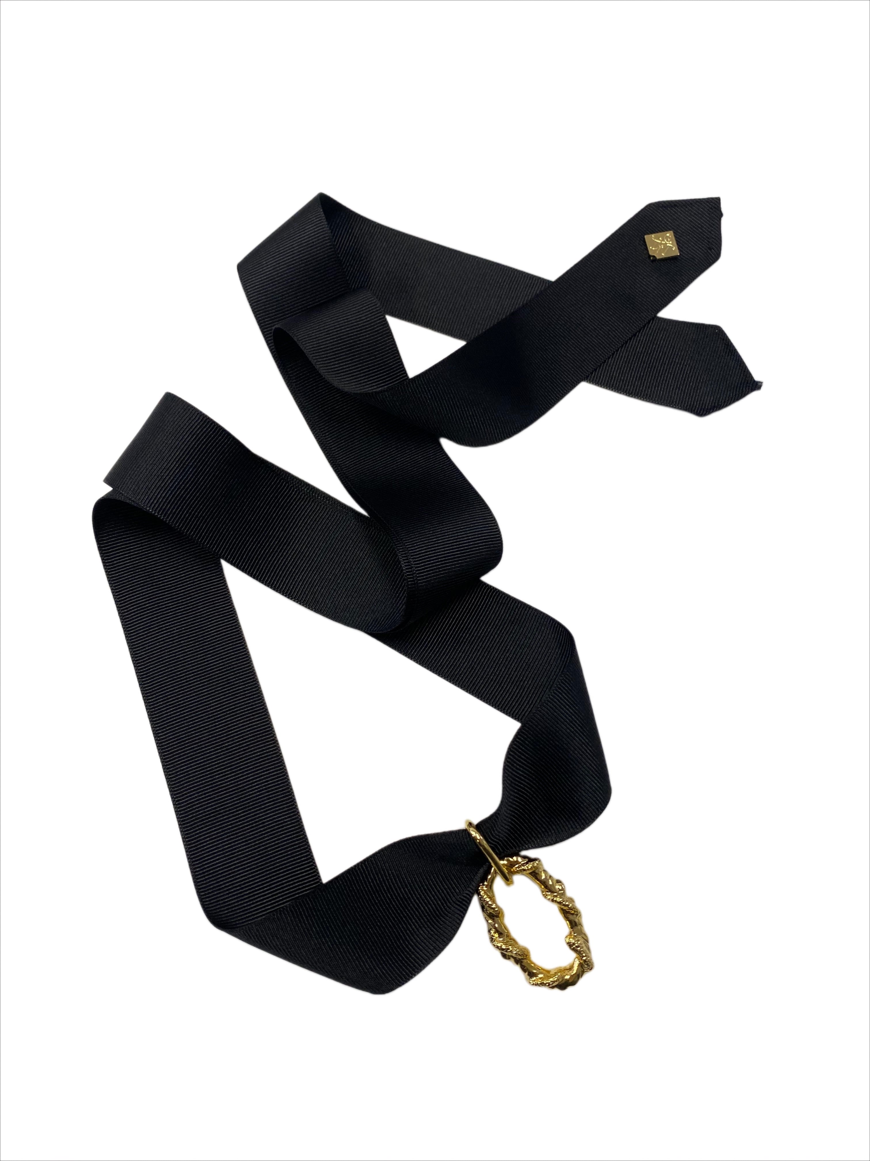グログランリボンの先にはブランドのロゴモノグラムのプレートが光ります。