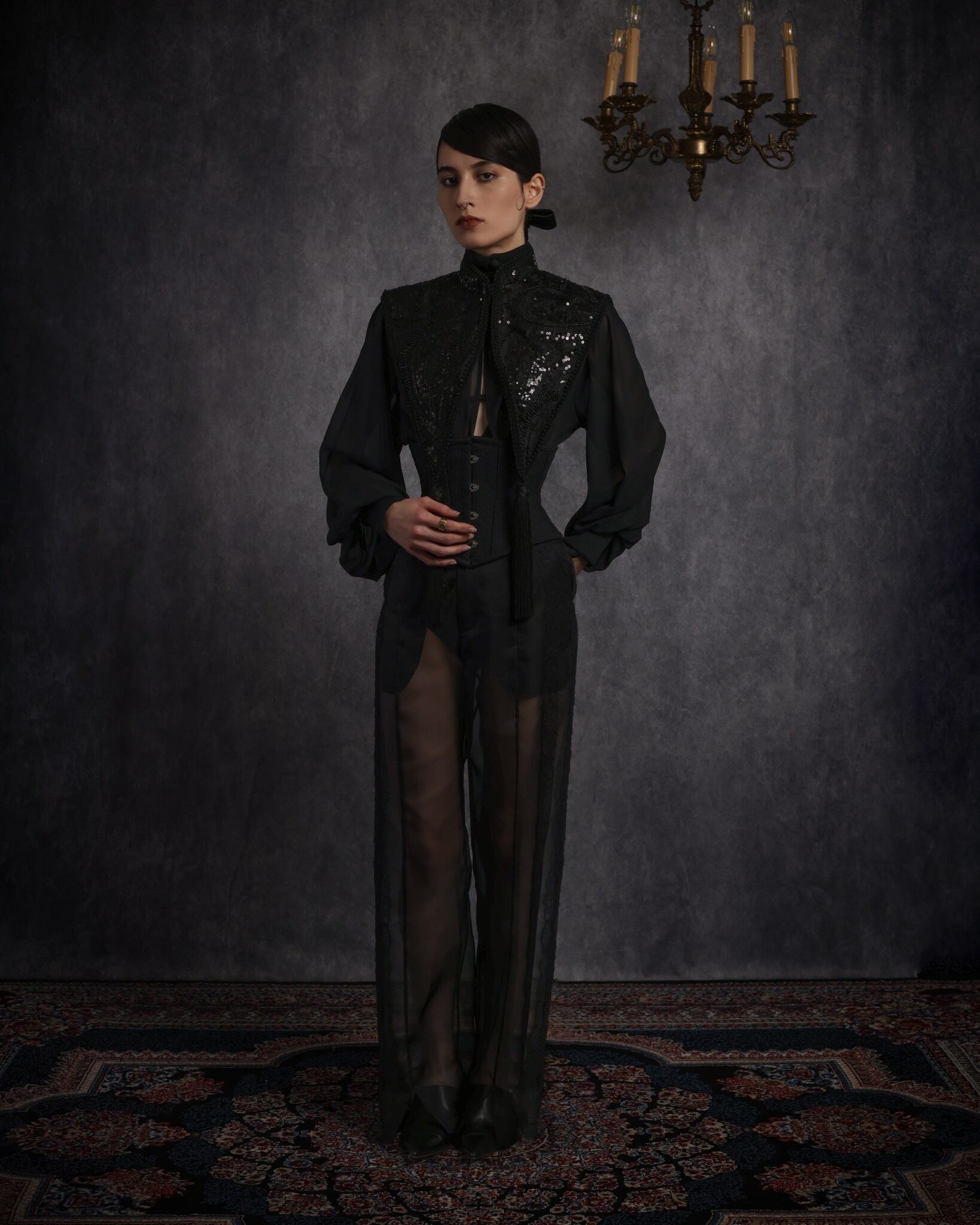 前にスリットが入っており、くるみボタンで留める仕様で、ボタンを下1個だけ留めて折り返すとえり風にも着て頂けます。