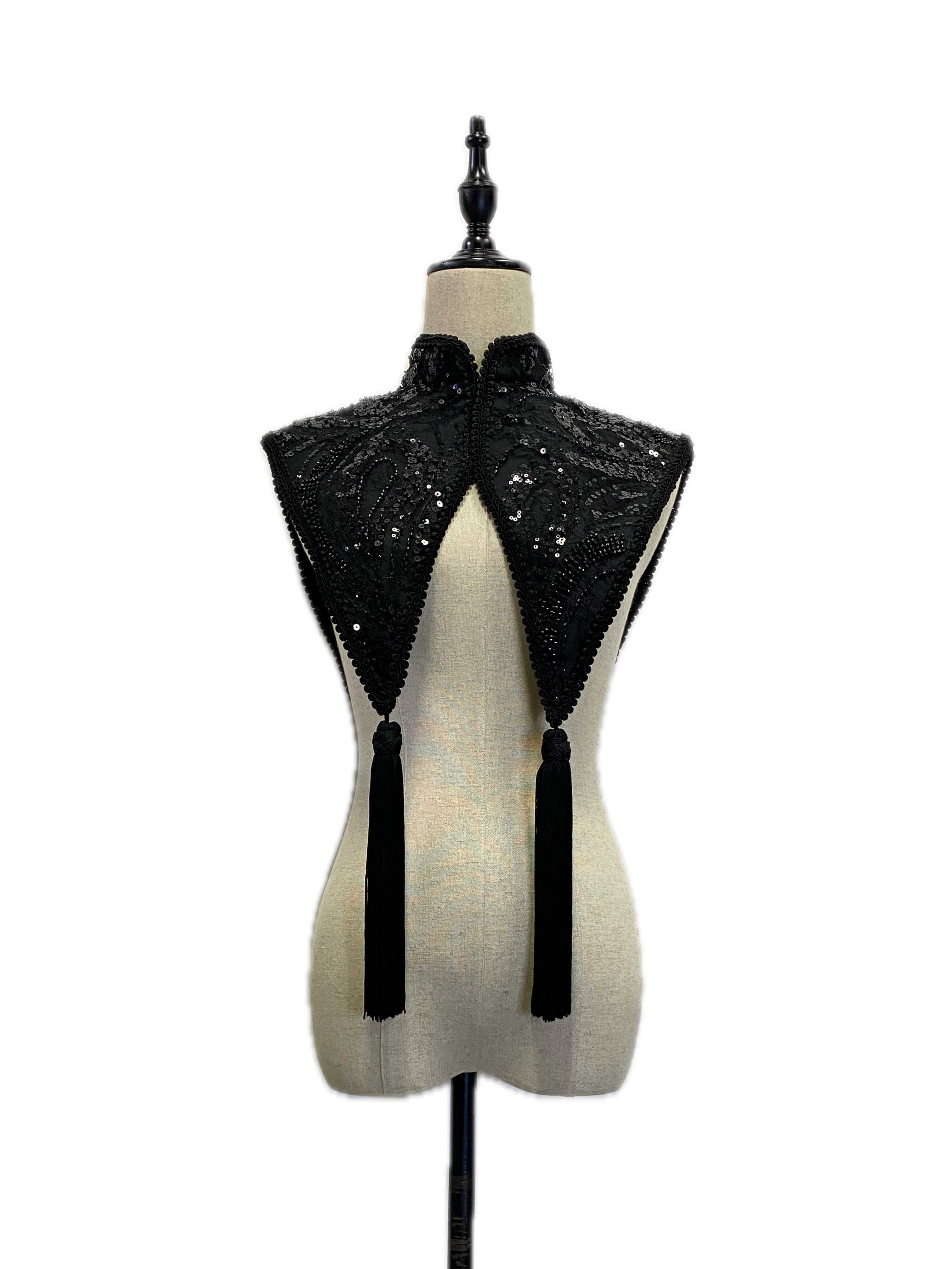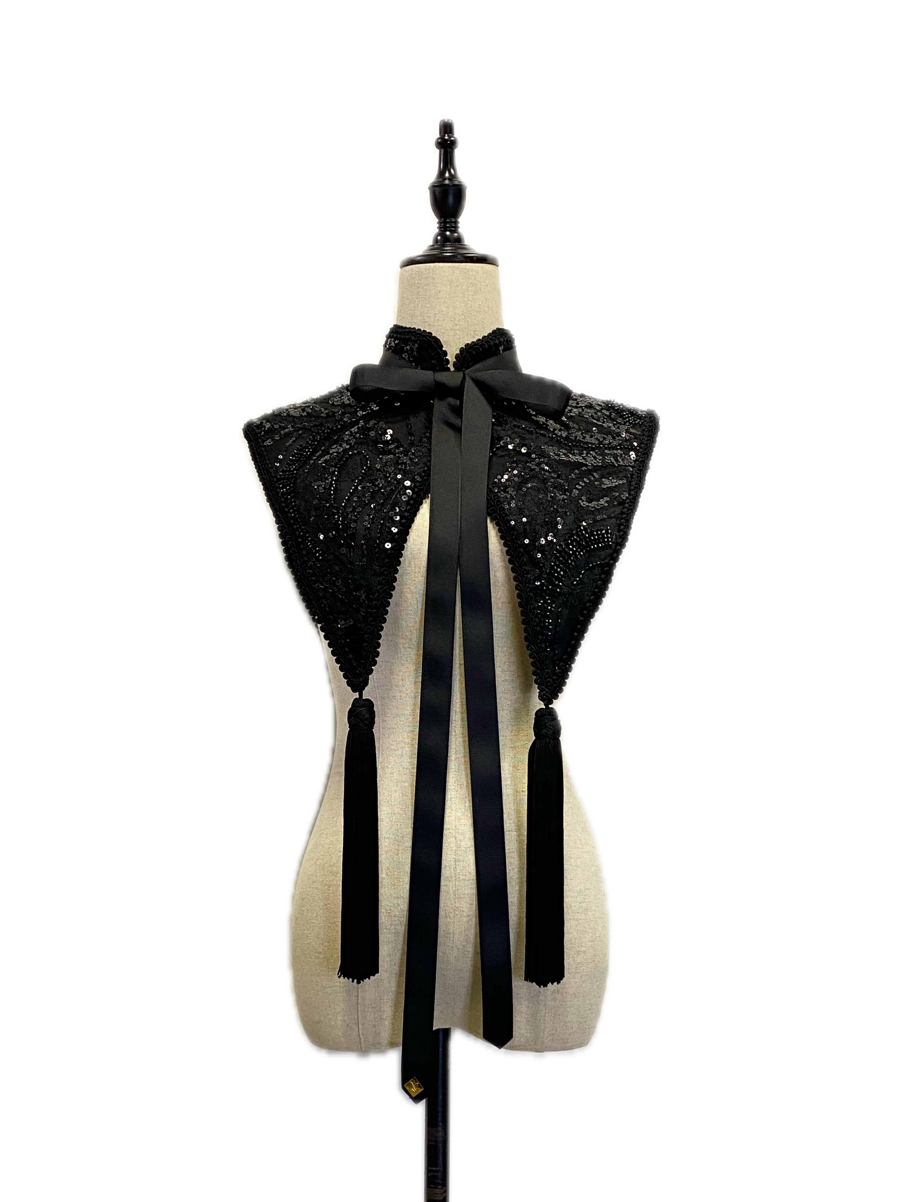 ジャカード生地の上にビーズスパンコール刺繍生地を被せ、ブレード装飾とフリンジを施した大変豪華なつけ襟です。