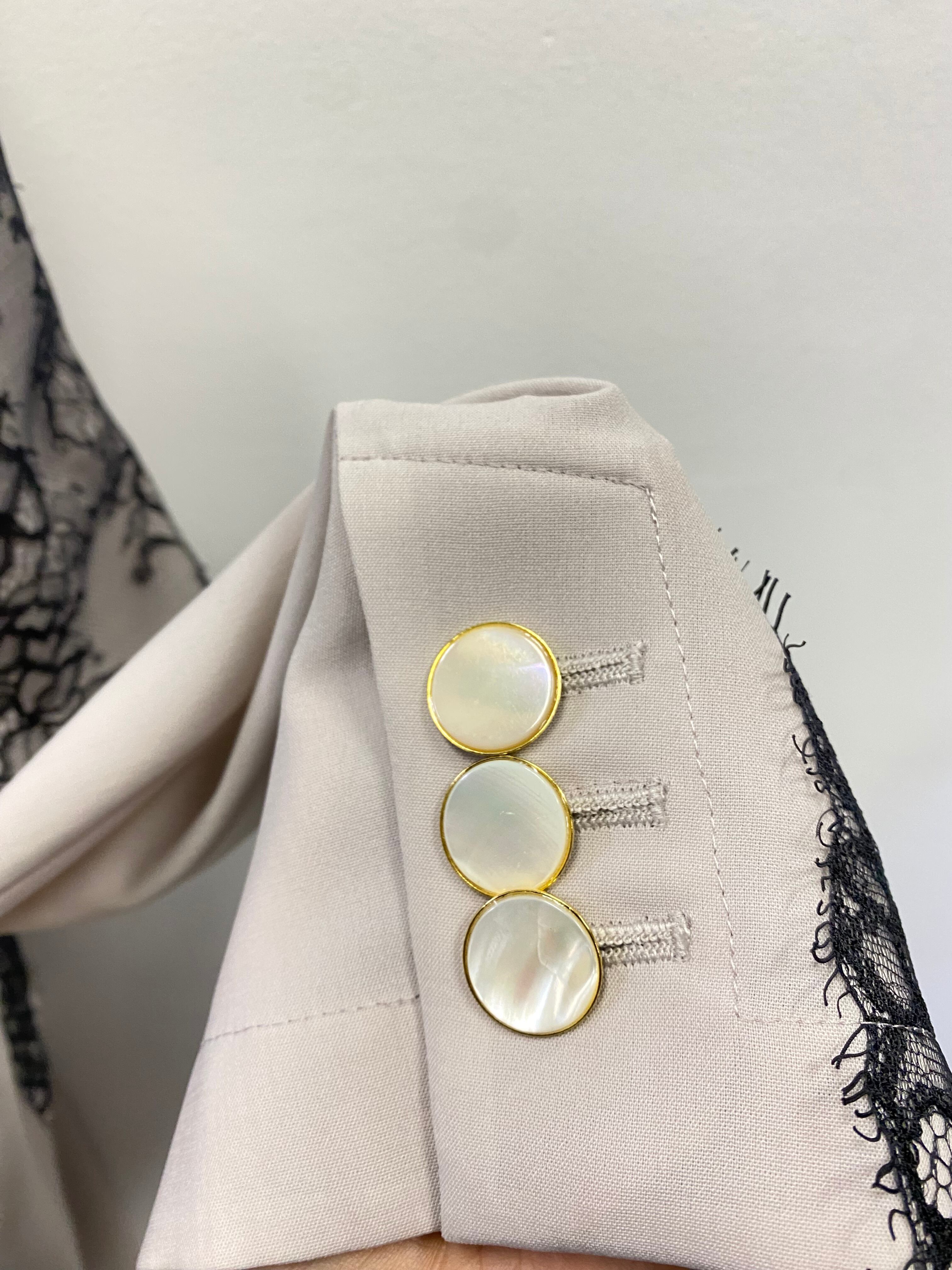 ボタンはベージュは白蝶貝、ブラックは黒蝶貝のボタンでゴールド枠にハマっております。