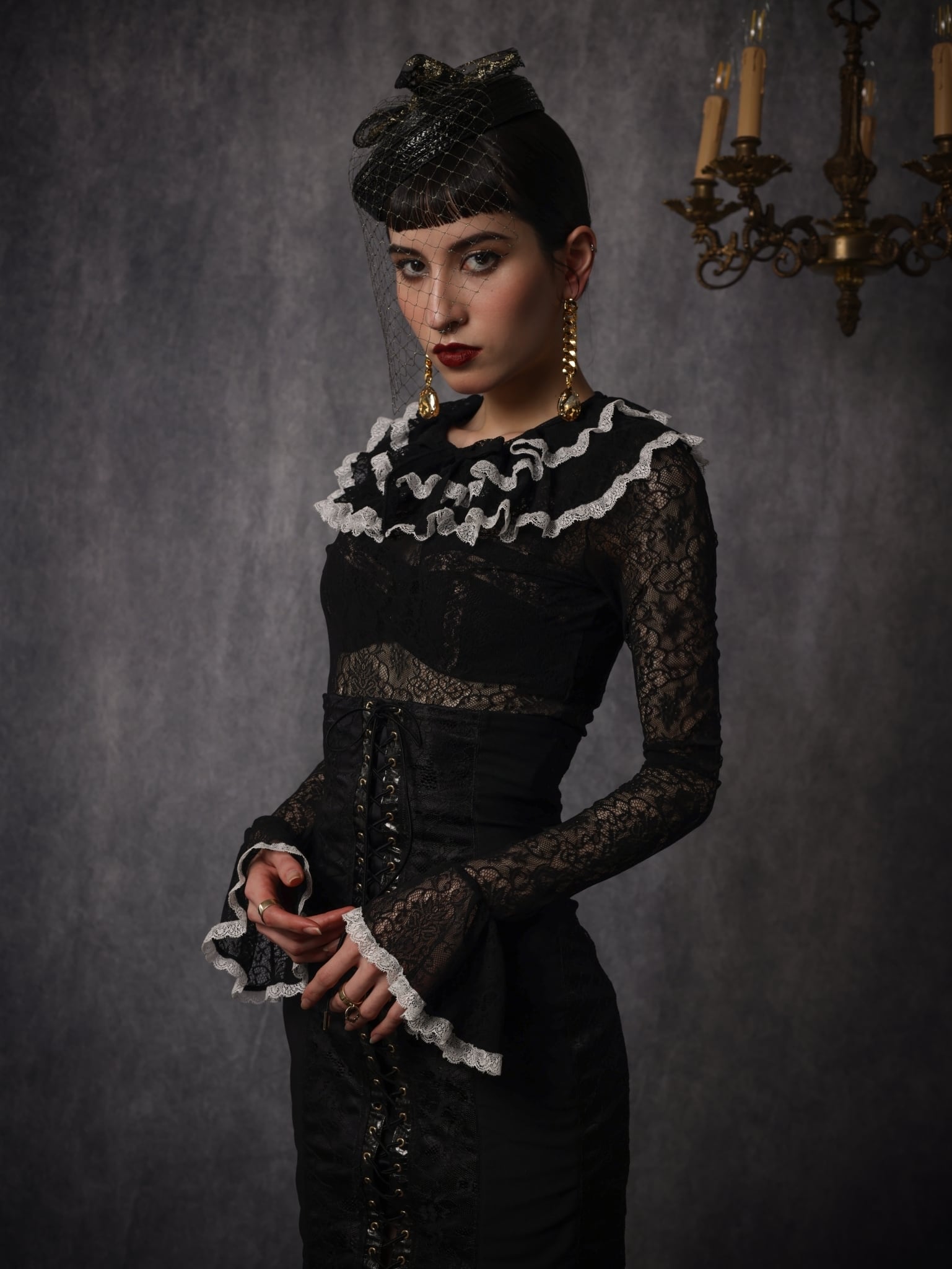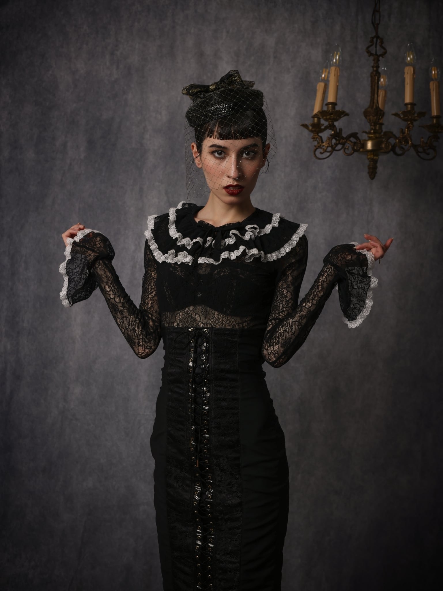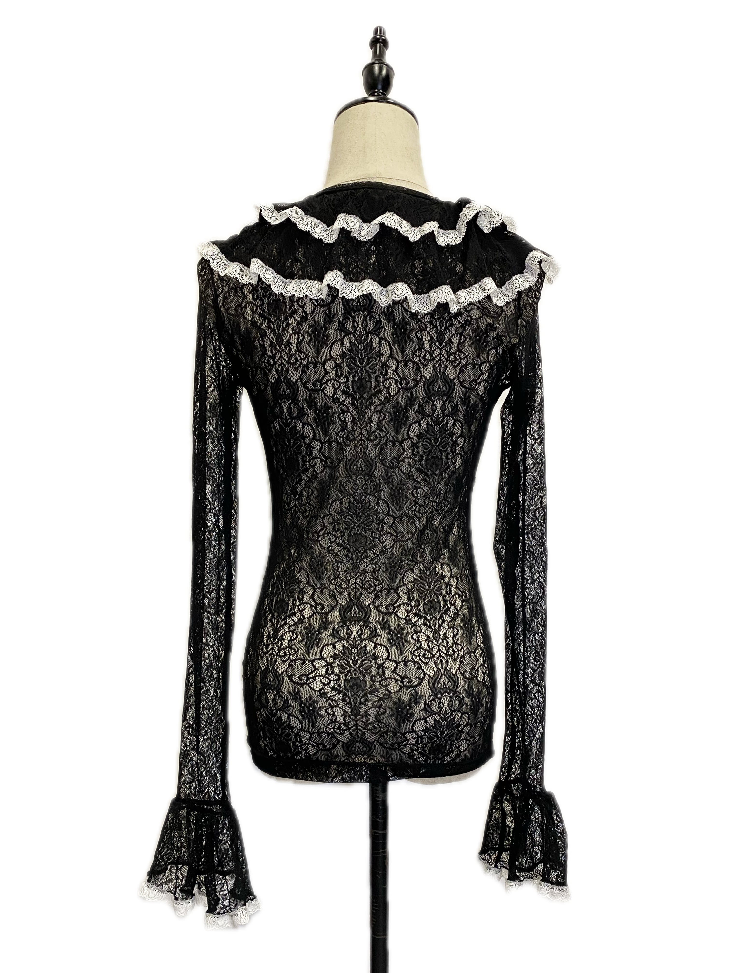 細いリバーレースを縁に施したフリルが袖口と、襟ぐりには2段、贅沢に使われています。