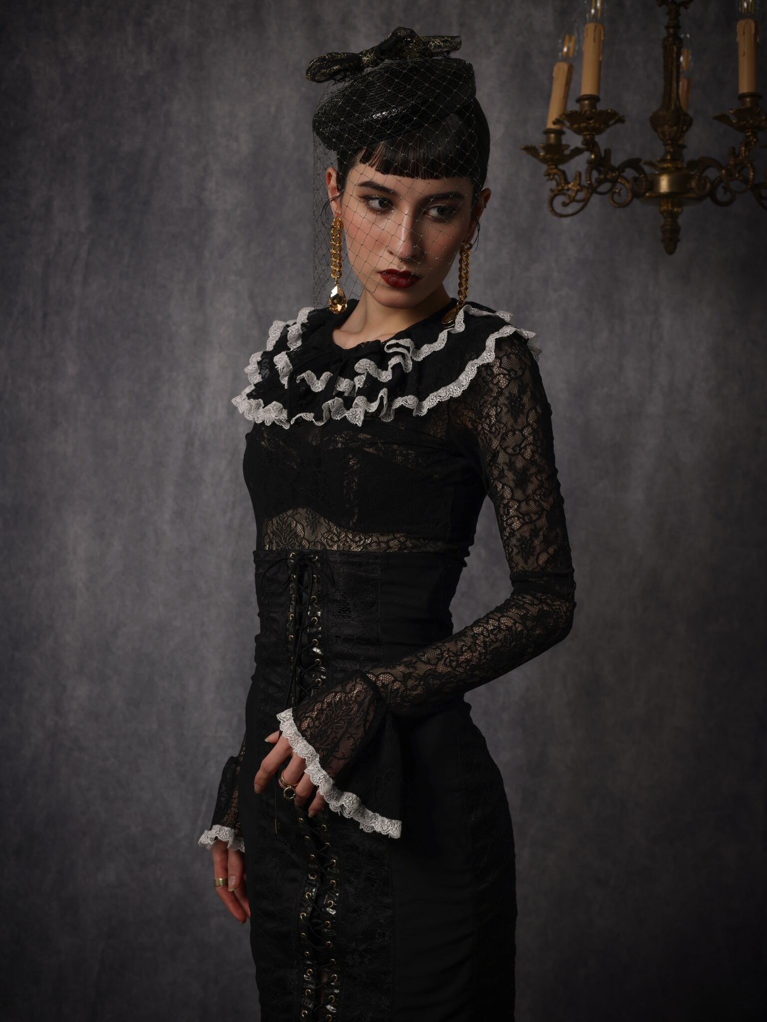 細いリバーレースを縁に施したフリルが袖口と、襟ぐりには2段、贅沢に使われています。