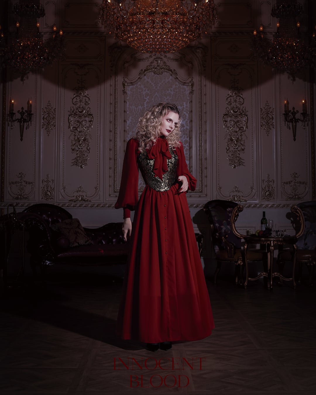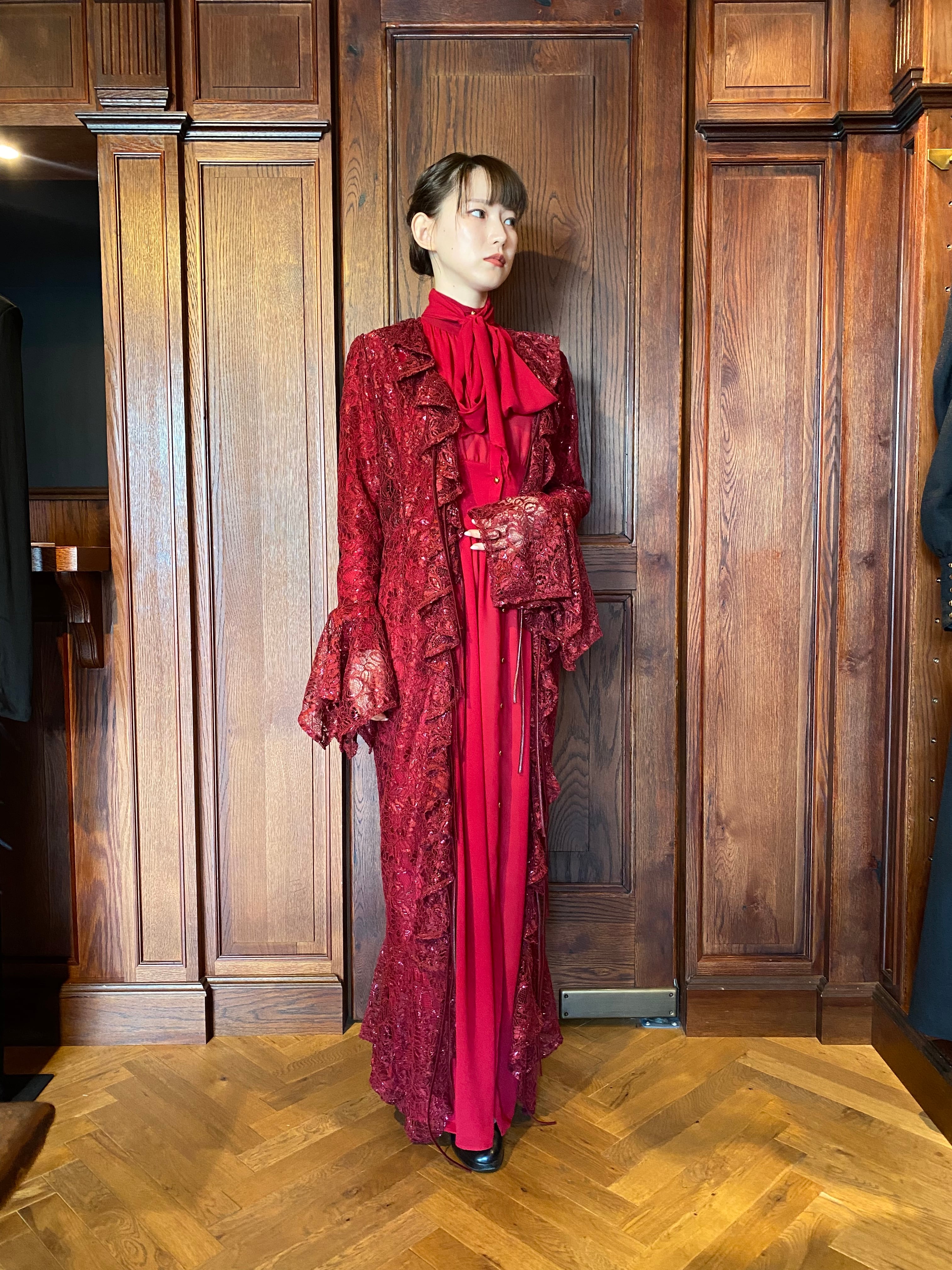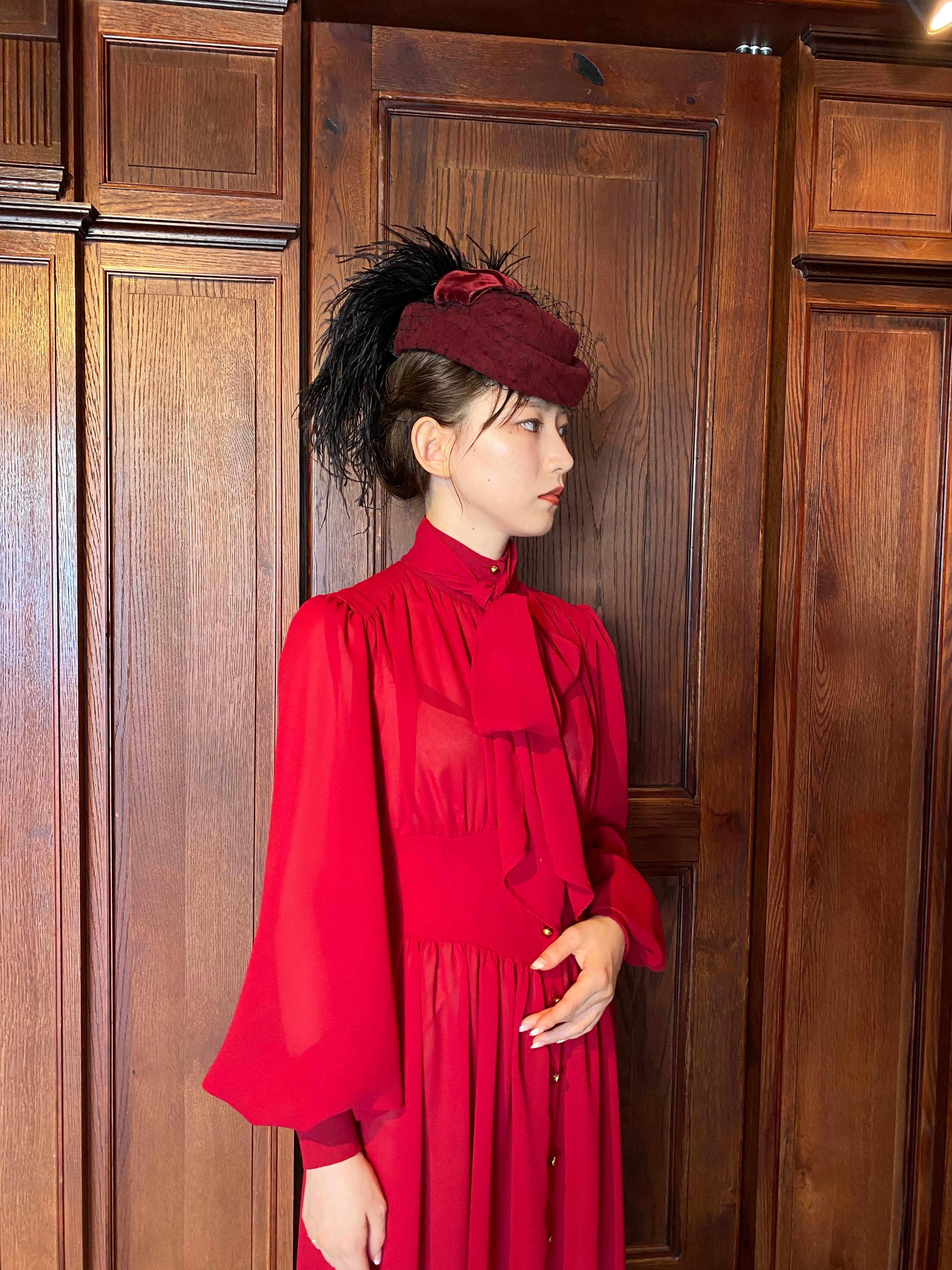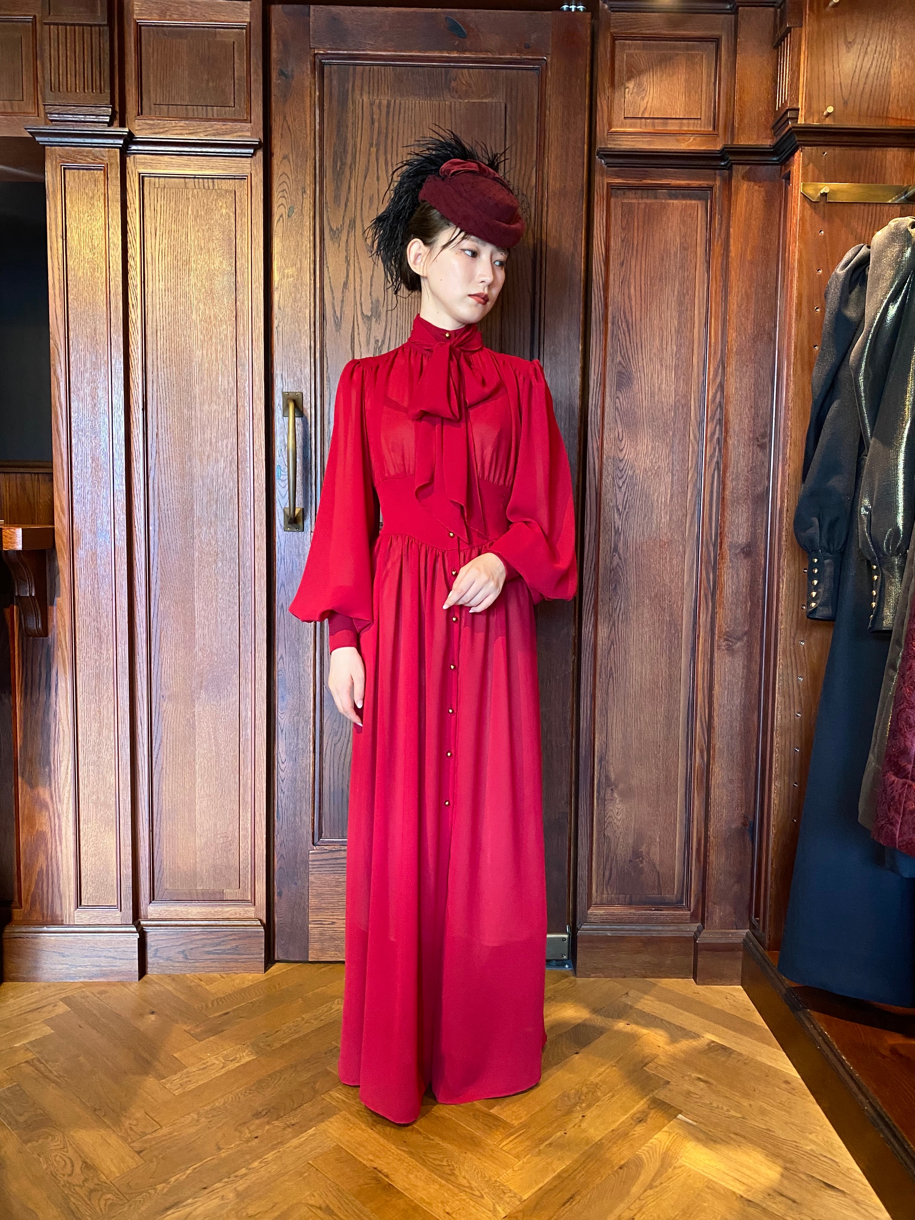 たっぷりとしたボリュームの袖とぴったりとした袖口、襟、ボタンとたっぷり生地を使った贅沢なドレスです。